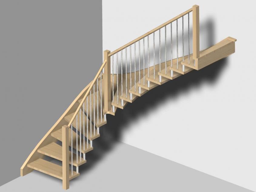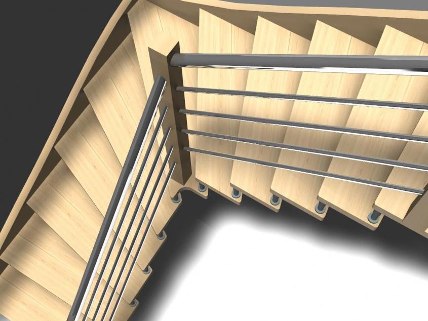 Sowohl die Bolzentreppe als auch die "Handlauftragende Treppe" ist wie eine normale Treppe zu handhaben. Der Grundriss der Treppe kann eine gängige Treppenform oder eine Sonderform sein, der mit der "Freien Treppe" erstellt wurde. Es besteht die Möglichkeit, die Innen- und Außenwange mit Bolzen oder mit einer Wange zu konstruieren. Seitliche Bohrungen und Spannstäbe können kundenspezifisch eingestellt werden. Handlauf und Geländer sowie Brüstungsgeländer können wie bei allen anderen stairCAD Treppen ergänzt werden.