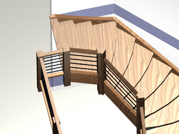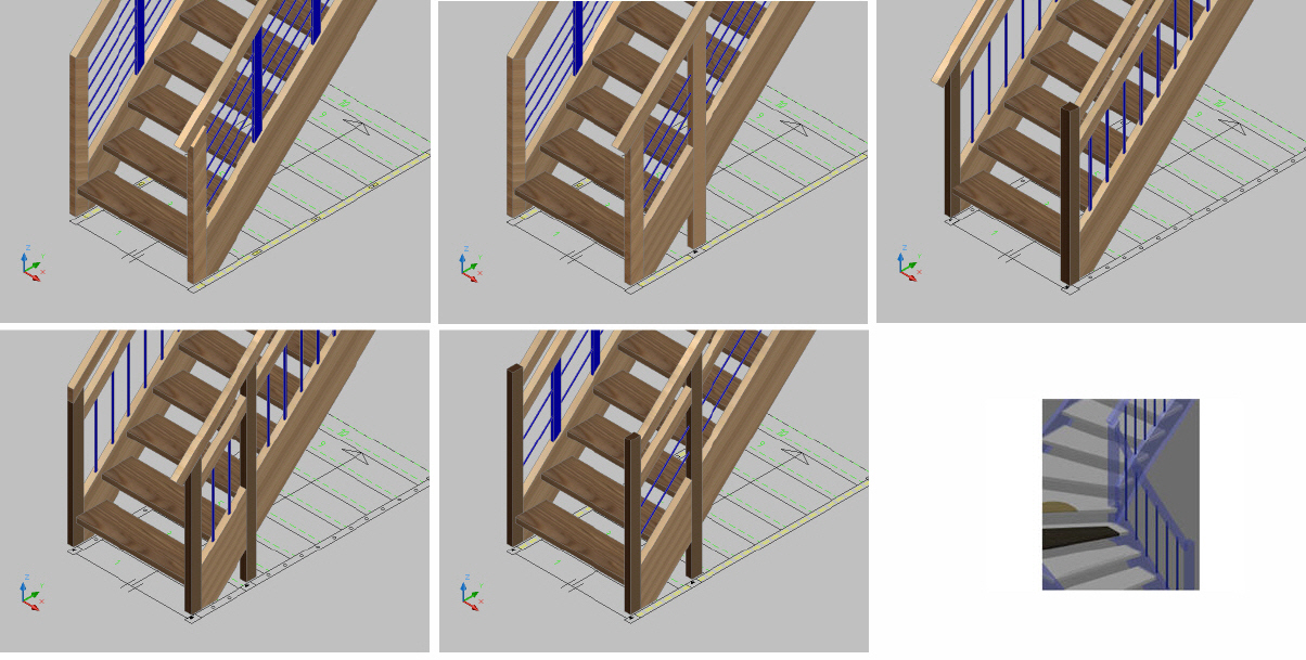 Alle Geländer, Pfosten und Stäbe werden 3D dargestellt, um den visuellen Eindruck der Treppe wiederzugeben (siehe auch Brüstungsgeländer).
