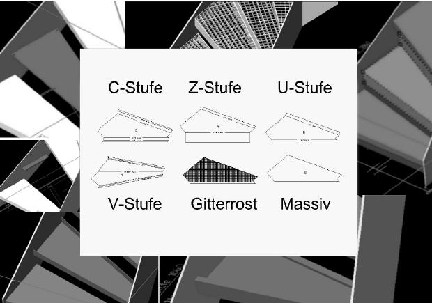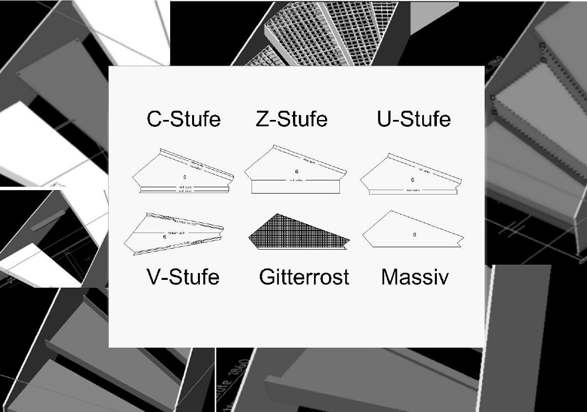 Eingestemmte Stufen, aufgelegte Stufen, abgerundete Stufen, eingefräste Stufen (Teppicheinlage, Rutschkanten, Steineinleger) und weitere Bearbeitungen sind möglich.