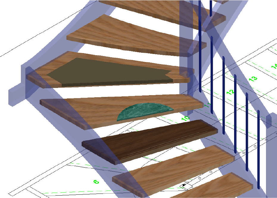 Rutschkanten, Steineinlegearbeiten, Teppicheinfräsungen, Stufenabrundungen vorn und hinten, unterschiedliche Untertritte, etc. sind in AICADstair selbstverständlich.